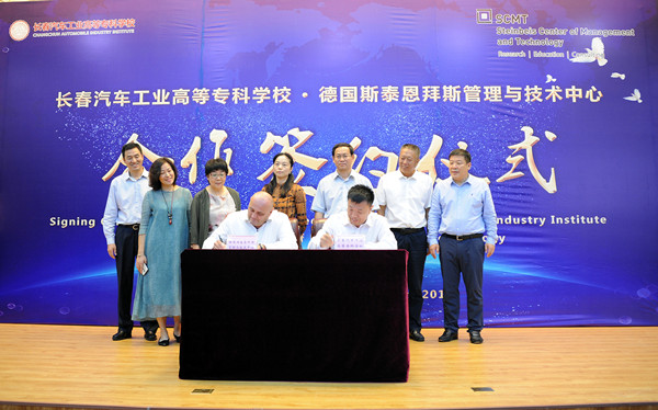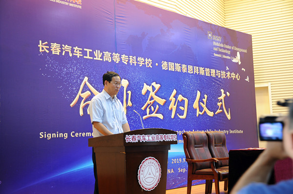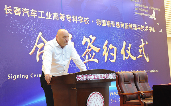 2019年9月5日上午10:30,长春汽车工业高等专科学校与德国斯泰恩拜斯管理与技术中心合作项目签约仪式,在长春汽车工业高等专科学校图书馆报告厅举行。德国斯泰恩拜斯大学创始人、斯泰恩拜斯管理与技术中心总裁、斯泰恩拜斯大学管理与技术学院院长沃尔特·贝克、德国哈尔博格学院院长王缜、北京埃尔伯格国际教育科技发展公司总经理郭晶、长春市教育局副局长张茂金、长春市教育局职成处处长张德文,我校党委书记安军、校长李春明、副校长明晓辉、副校长胡国良、副校长丁卓等学校领导参加了签约仪式。签约仪式由丁卓副校长主持。
