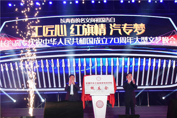当晚,学校体育场上灯光璀璨,红旗招展,汇聚成欢乐的海洋。晚会开始前举行了庄严的校友会揭牌仪式。仪式由副校长明晓辉主持,吉林省教育厅巡视员、副厅长战高峰与中国工商银行吉林省分行副行长孙占国共同为校友会揭牌。学校党委书记、学校校友会首任理事长安军在致辞中指出:伴随新中国的造车梦想,几代汽专人砥砺奋进、风雨同舟,与民族汽车工业同生共长、与祖国发展壮大同频共振,培养的8万名优秀毕业生,为振兴东北老工业基地、圆梦中国自主汽车工业做出了巨大贡献。学校的飞跃发展,铭刻着各级党委政府的坚强领导,饱含着全校所有师生员工的重度参与,承载着社会各界的力量托举,更与所有校友的关心支持密不可分。我们通过今天的晚会,一并表示最衷心的感谢!