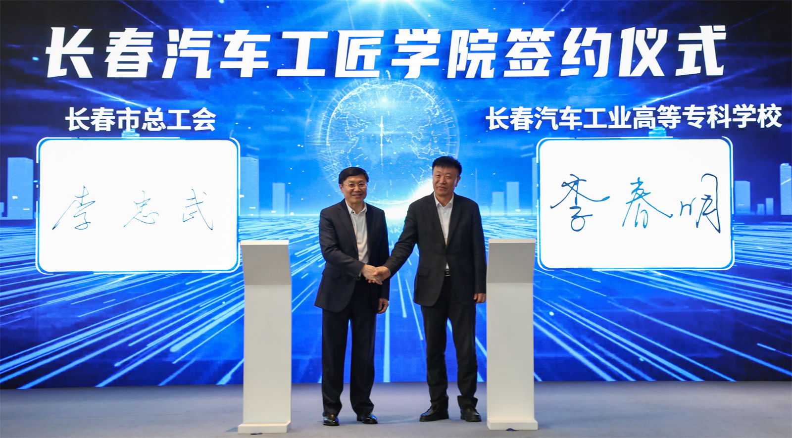 仪式上,长春市总工会党组成员、副主席李忠武和我校党委副书记、校长李春明代表会校双方签订战略合作协议。长春市人大常委会副主任、市总工会党组书记、主席唐铁生与我校党委书记安军,党委副书记、校长李春明共同为长春汽车工匠学院揭牌。