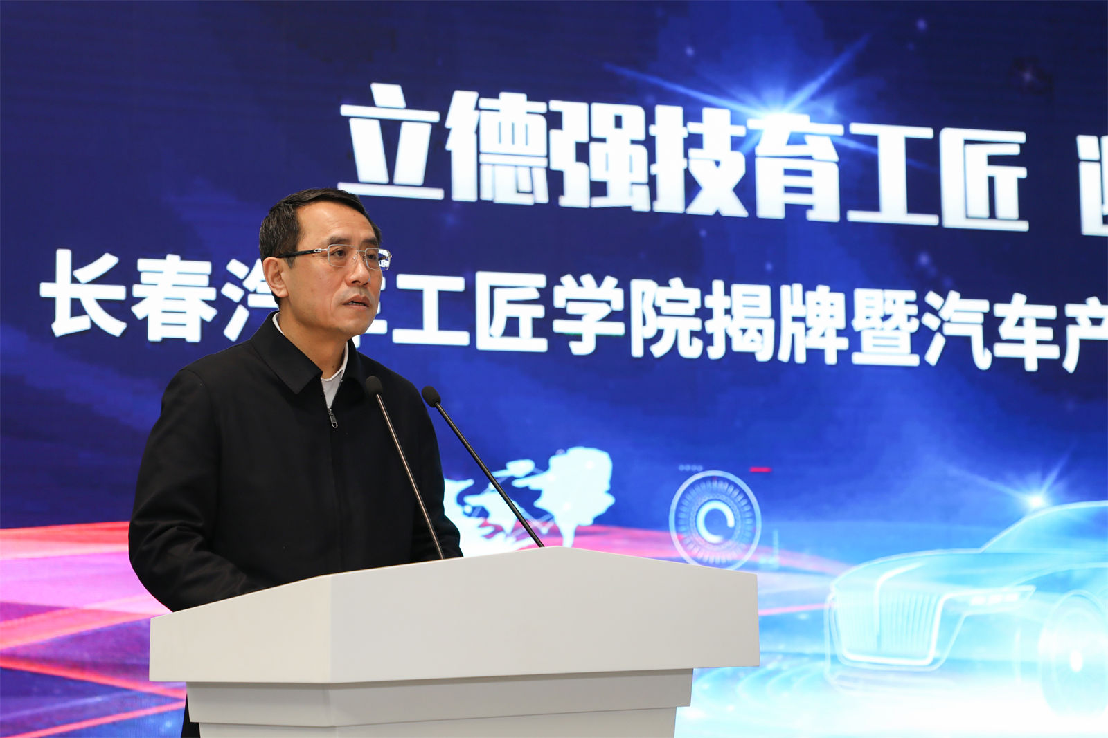市人大常委会副主任、市总工会党组书记、主席唐铁生发表讲话。唐铁生表示,希望学院以此为新的起点,牢牢把握汽车产业“电动化、智能化、网联化、共享化”的重大机遇,大力弘扬劳模精神、劳动精神、工匠精神,加快打造一支知识型、技能型、创新型的高素质汽车产业工人队伍,为长春打造世界级汽车产业基地提供人才支撑。希望学院办出特色、创出品牌、树起标杆,创新管理运营模式,推进产教协调育人,努力把学院打造成传承工匠精神、培育工匠人才、开展技能比拼、促进技术创新的产教融合平台,助力长春打造“万亿级”国际汽车城的崭新格局,为吉林全面振兴全方位振兴贡献新的更大力量,谱写更多更精彩的汽车工匠故事。
